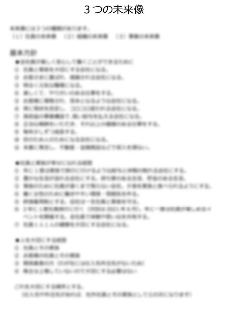 社員一人一人に口頭だけで説明しようとすると、伝えるたびに内容・ニュアンスが変わってしまったり、伝える人によっても変わってきたりもします。- 会社の将来
